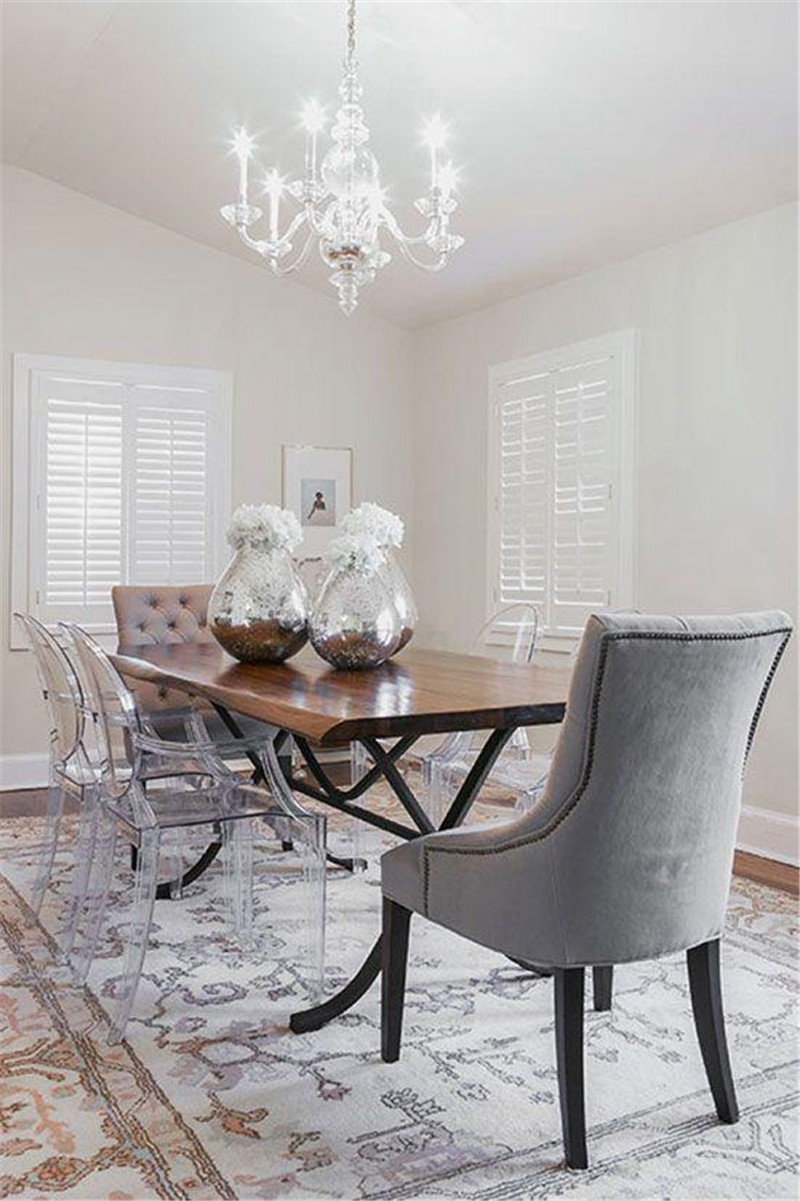 餐厅则是独立的空间,长方形餐桌能够容纳更多人用餐,透明餐椅在视觉上更加通透,让空间气氛变得轻盈。精致的水晶吊灯让空间气质更高一筹。