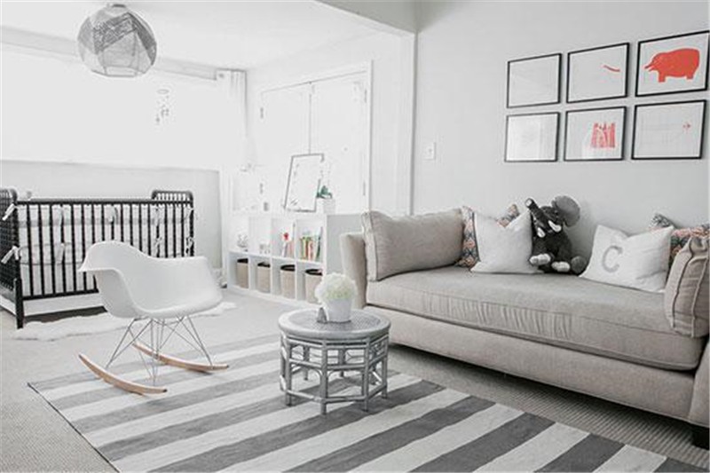 客厅配色选择了淡雅柔和的色彩,让空间气质更加优雅。白色墙面为基底,浅灰色沙发与深灰色地毯构建出空间层次,两幅装饰画组成沙发背景墙,简约中不失时尚。