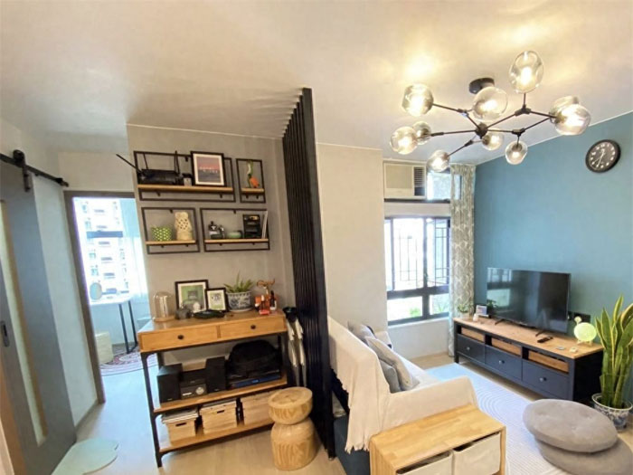 客厅的侧边,为了不浪费空间,还做了通顶的柜子,用来收纳一些日常杂物和衣服,尽可能将纵向空间充分利用起来,细节做得很不错。