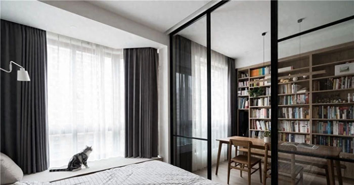 ▲唯一分割出来的卧室空间,为了采光和空间通透,与客厅采用通透玻璃移门分割